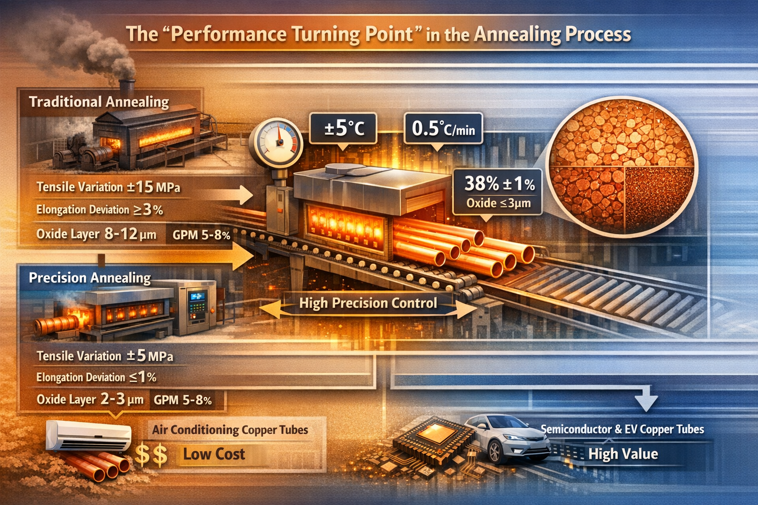 | Traditioneller Glühprozess | Im Inland hergestellter kohle-/ölbefeuerter Glühofen, manuell gesteuerte Temperatur. | ±8-10℃ | Die Zugfestigkeit schwankt um ±15 MPa, die Dehnungsabweichung beträgt 3–5 % und die Oxidschicht ist 8–12 μm dick. | Standard-Kupferrohre für Klimaanlagen, Gebäude-Kupferrohre | 800-1000 |