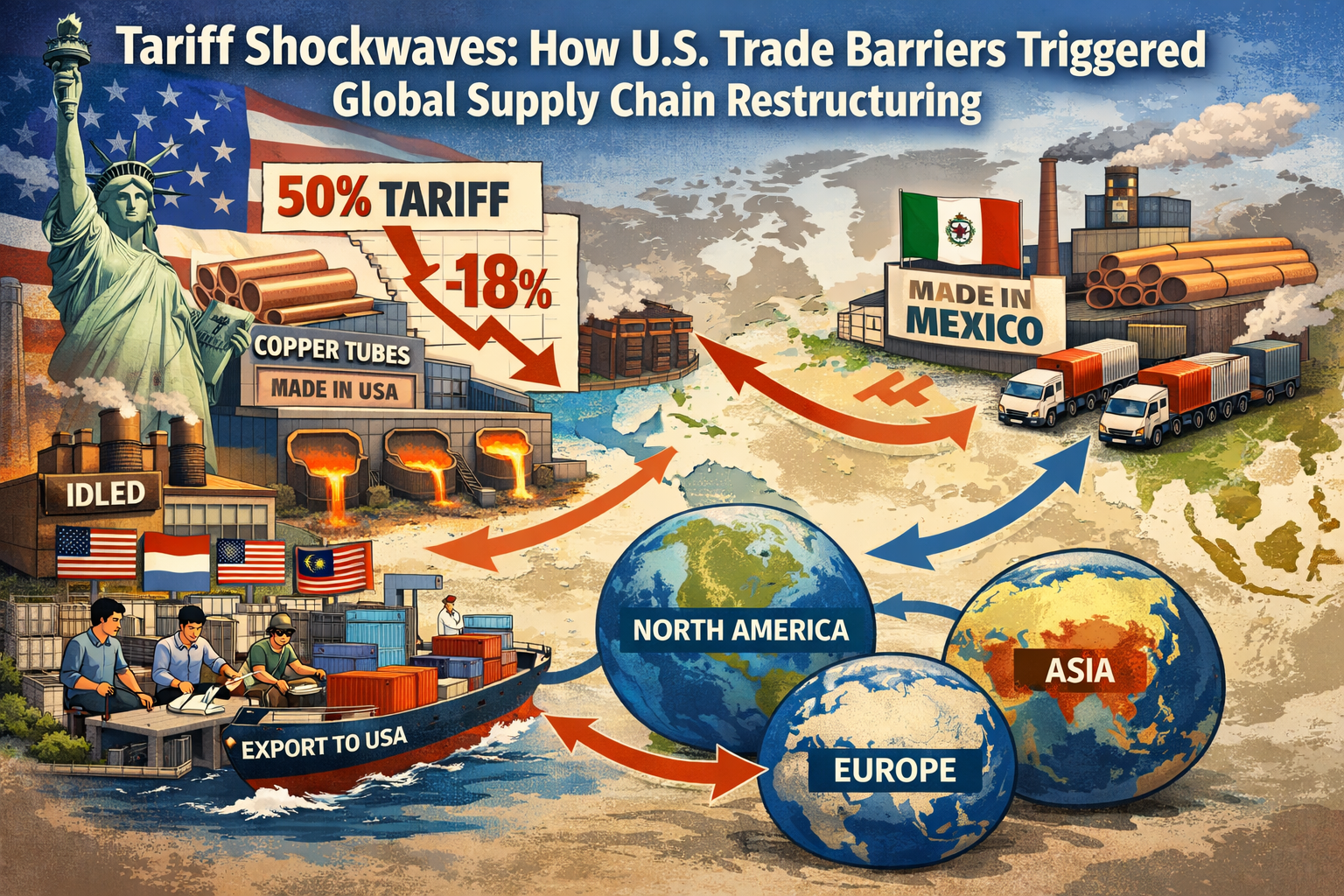 Untertitel: Wie stieg die Produktionskapazität in Südostasien und Mexiko innerhalb eines Jahres um 46,3 %, als die USA 50 % Zölle auf Kupferrohre einführten und eine Umstrukturierung der globalen Handelskette auslöste? Diese politisch bedingte Migration der Lieferkette verändert die globale Wertverteilungskarte für Kupferrohre.