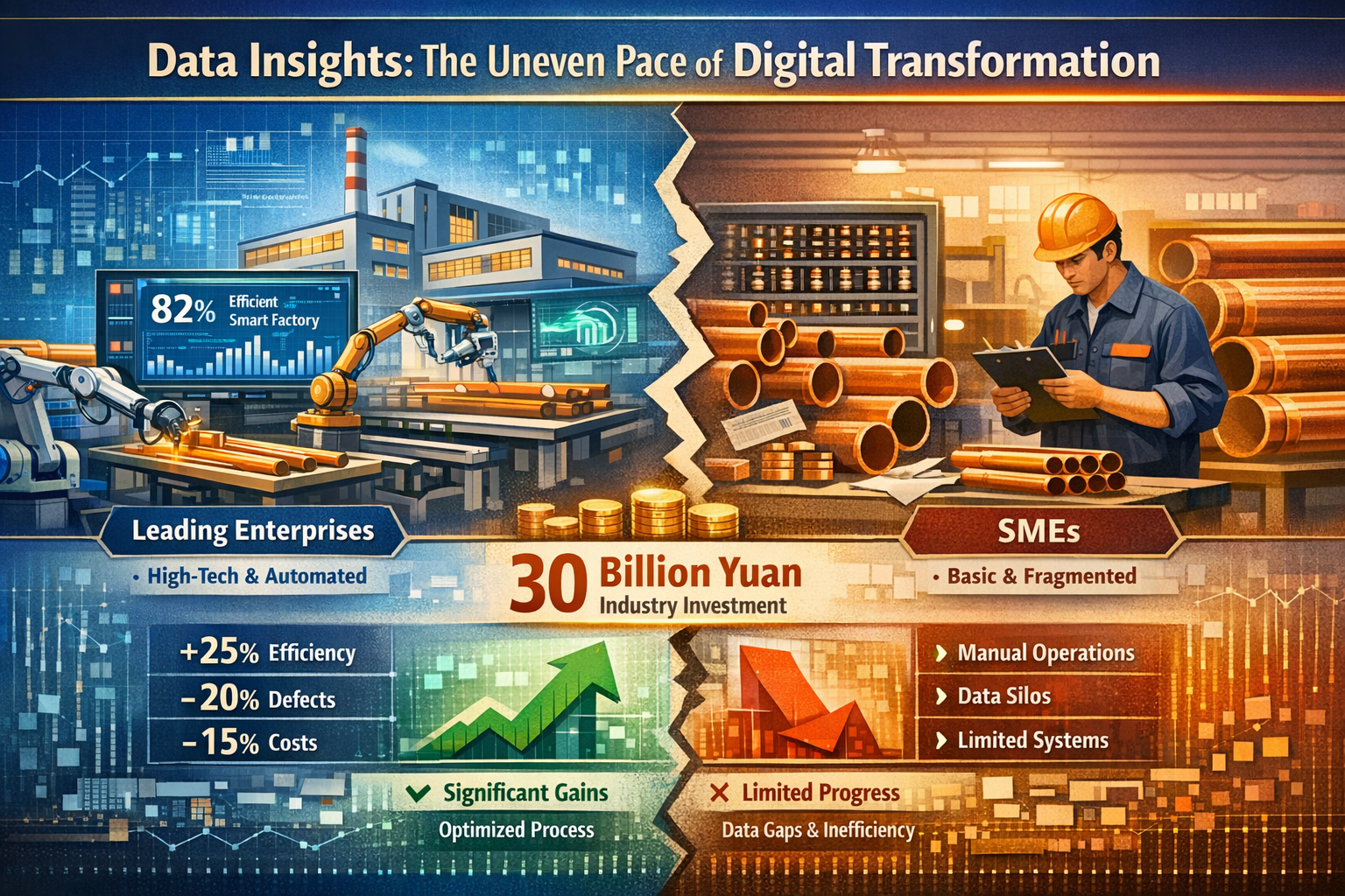 „Wir haben über 8 Millionen Yuan für ein ERP-System und eine Produktionsüberwachungsplattform ausgegeben, aber am Ende haben wir unsere papierbasierten Hauptbücher nur online verlagert. Die Produktionseffizienz hat sich nicht wesentlich verbessert und sogar die Arbeitsbelastung für unsere Mitarbeiter erhöht.“ Herr Wang, der Leiter eines mittelständischen Unternehmens Kupferrohr Unternehmen in der Provinz Henan, brachte das gemeinsame Dilemma zum Ausdruck, mit dem die Branche bei ihrer digitalen Transformation konfrontiert ist. Angetrieben durch die Initiative „Made in China 2025“ und die Industrie 4.0-Welle hat die Kupferrohrindustrie einen Anstieg der digitalen Transformationsbemühungen erlebt, wobei Unternehmen, von führenden Unternehmen bis hin zu kleinen und mittleren Herstellern, stark in intelligente Geräte und digitale Systeme investieren. Die Realität ist jedoch, dass die meisten Unternehmen in einem Teufelskreis „hohe Investitionen, geringe Rendite“ gefangen sind und die Digitalisierung oberflächlich bleibt; Nur wenige Unternehmen haben eine umfassende Stärkung erreicht und die Digitalisierung genutzt, um die gesamte Produktions-, Lieferkette- und Kundendienstkette zu verbinden, was zu Kostensenkungen und Effizienzsteigerungen führt. Auf der einen Seite gibt es den Formalismus „Digitalisierung um der Digitalisierung willen“ und auf der underen Seite die effektive Transformation „Wertschöpfung durch Digitalisierung vorantreiben“. Warum gibt es eine solche Polarisierung in der digitalen Transformation der Kupferrohrindustrie? Dahinter verbirgt sich ein komplexes Zusammenspiel von kognitiven Vorurteilen, technologischer Anpassung, Talentförderung und strategischer Planung, das auch die zentrale Triebfeder für die qualitativ hochwertige Entwicklung der Branche darstellt.