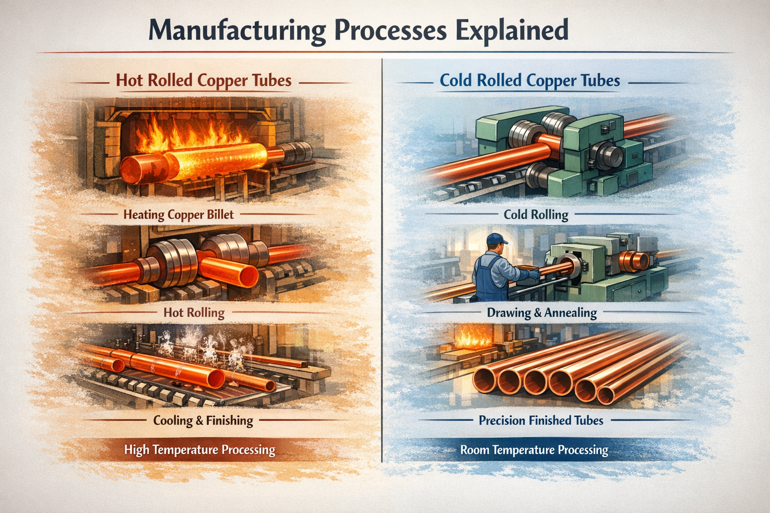 Kupferrohre sind wesentliche Komponenten in Branchen wie HVAC&R, Kältetechnik, Elektronik, Sanitär, Automobilbau und Industrieausrüstung. Da die weltweite Nachfrage nach effizienten und zuverlässigen Materialien weiter wächst, arbeiten viele Käufer eng mit einem Fachmann zusammen Kupferrohrfabrik Produkte auszuwählen, die spezifische technische und anwendungsbezogene Anforderungen erfüllen. Zu den häufigsten Optionen gehören kaltgewalztes Kupferrohr und warmgewalztes Kupferrohr unterscheiden sich deutlich in Leistung, Verarbeitung und Eignung.