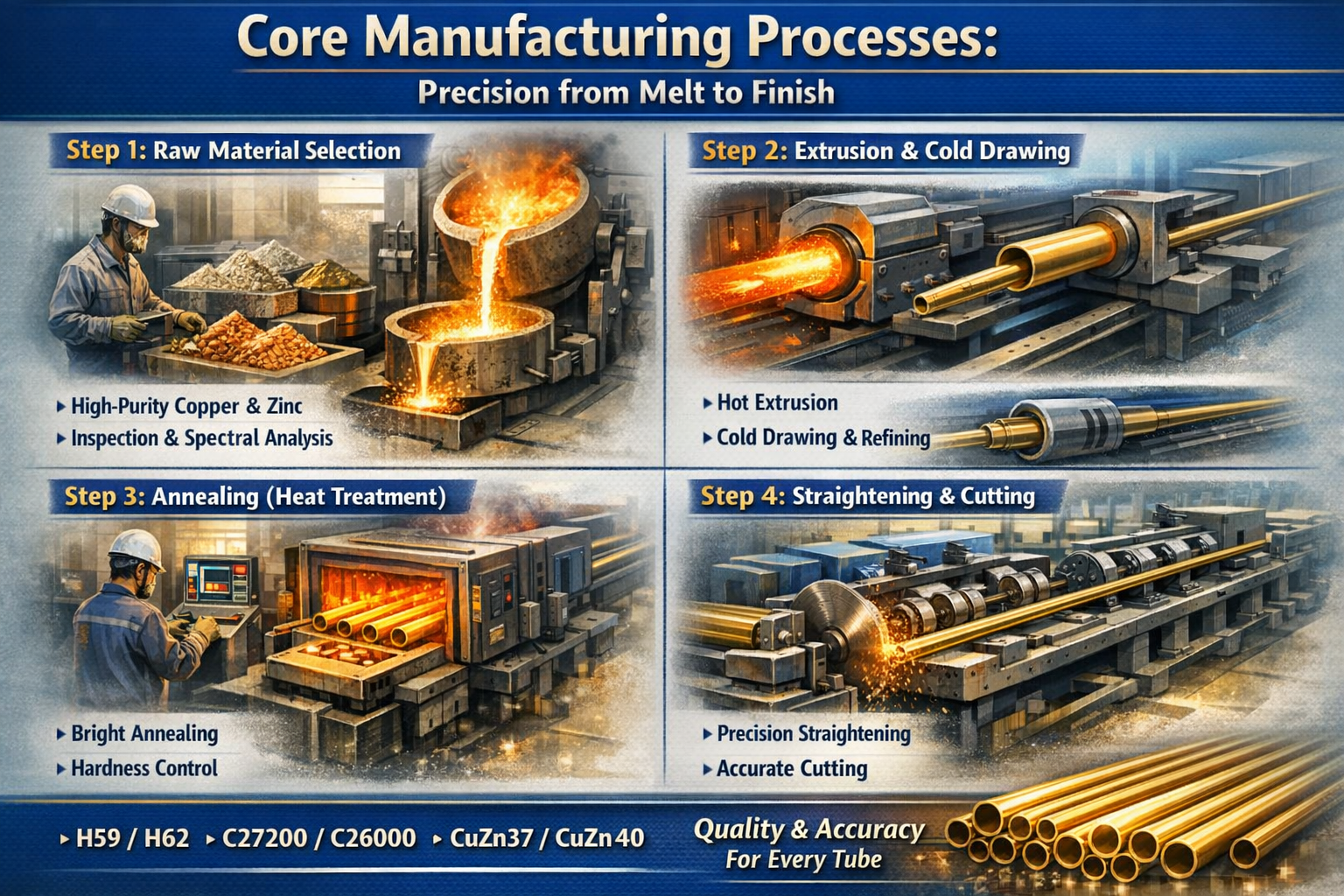 Transparenz ist die Grundlage des Vertrauens in B2B-Partnerschaften. Eine professionelle Messingrohrfabrik „fertigt“ nicht nur Rohre; Es folgt einer strengen, wissenschaftlich kontrollierten Reihenfolge, um sicherzustellen, dass jeder Millimeter des Produkts internationalen Standards entspricht.