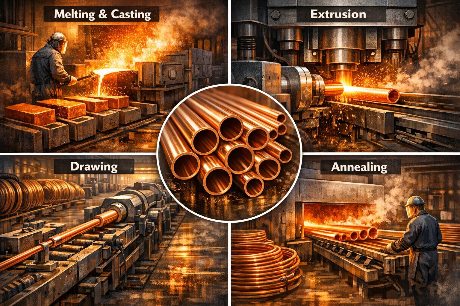 Wenn man eine Kupferrohrfabrik betritt, fühlt man sich wie in eine Welt voller Feuer und Präzision. Der Prozess, einen schweren Metallblock in ein dünnes, hohles Rohr zu verwandeln, ist eine technische Meisterleistung. Lassen Sie es uns in vier einfache Schritte unterteilen: