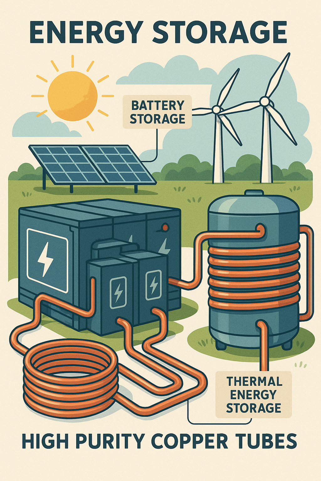 Die Energiespeicherung ist eine entscheidende Komponente der Infrastruktur für erneuerbare Energien und trägt dazu bei, die intermittierende Natur von Quellen wie Sonne und Wind auszugleichen. Hochreine Kupferrohre werden in verschiedenen Energiespeichersystemen eingesetzt, darunter Batterien und thermische Speichersysteme . Diese Systeme erfordern Komponenten, die Wärme und Strom effizient verwalten können, um eine zuverlässige Leistung zu gewährleisten.